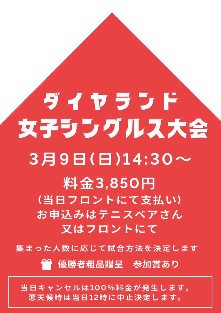 2025年02月26日 女子シングルス大会 開催のお知らせ 大会情報 3月9日(日)に「ダイヤランド女子シングルス大会」を開催します。 詳細・お申し込みはフロントまたはテニスベアさんよりお願いします。 テニスベア 大会情報ページ