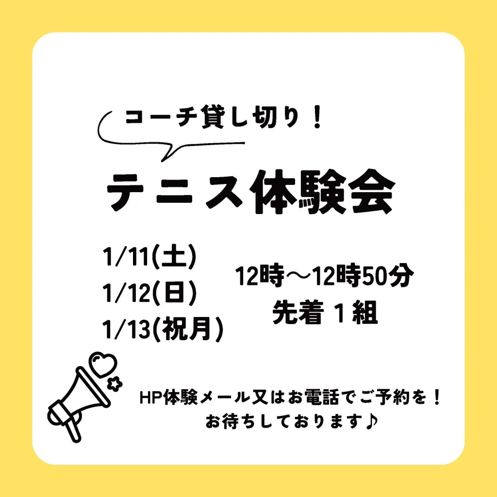 2024年12月27日 テニス体験会のご案内 スクール 1月11日(土)・12日(日)・13日(月)に、テニススクールの体験会を開催します。 お友達同士やご家族でテニスを体験してみませんか?各日先着1組限定です! お問合せお待ちしております。