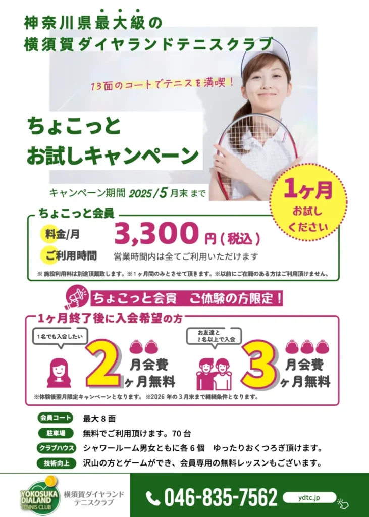 〇月会費プラス5,500円/月4回で併設テニススクール土日クラスのレッスン・ナイタークラスのレッスンを受講いただけます