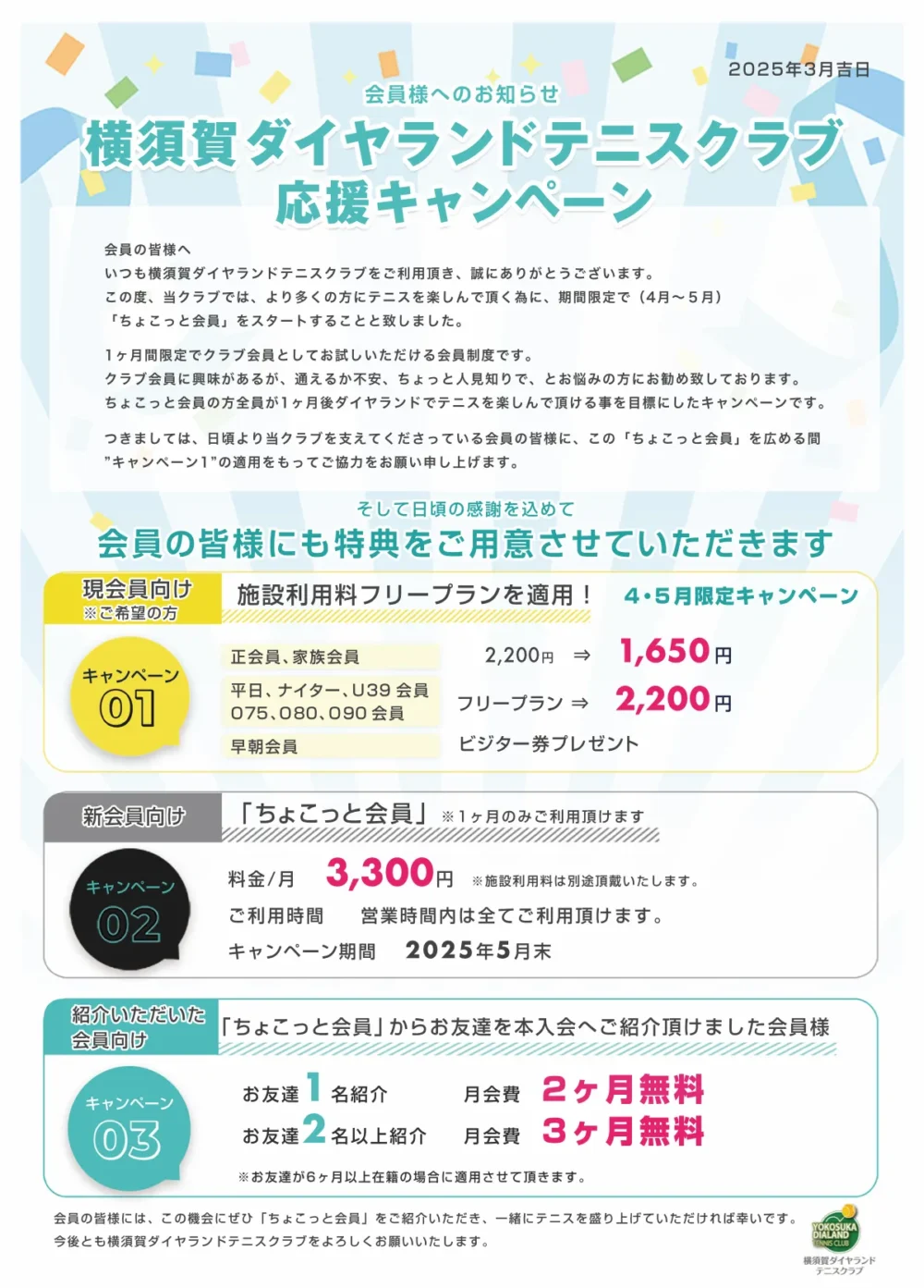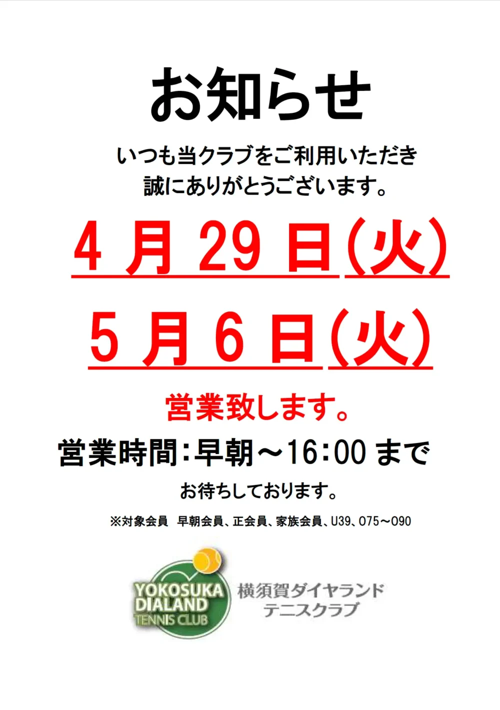 ※クラブ・コーチの都合により会員レッスンを変更または中止する場合がございます。